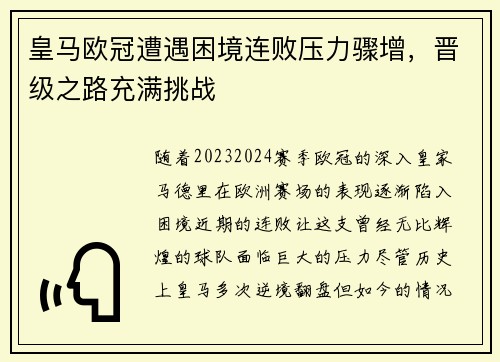 皇马欧冠遭遇困境连败压力骤增,晋级之路充满挑战