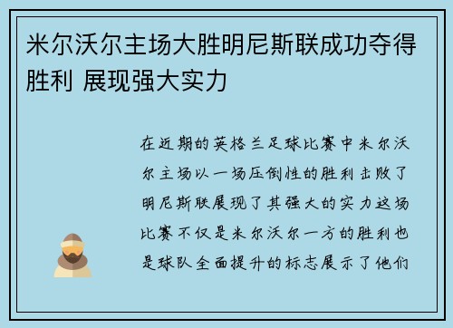 米尔沃尔主场大胜明尼斯联成功夺得胜利 展现强大实力