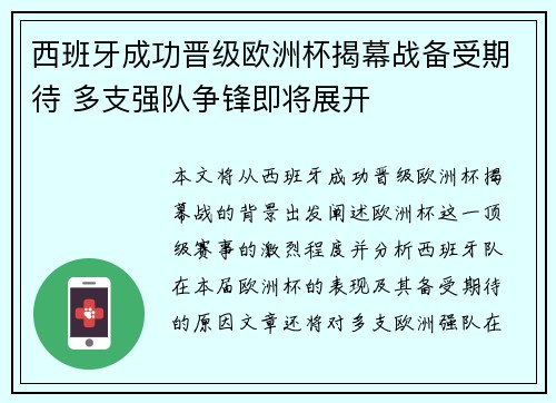 本文将从西班牙成功晋级欧洲杯揭幕战的背景出发,阐述欧洲杯这一顶级赛事的激烈程度,并分析西班牙队在本届欧洲杯的表现及其备受期待的原因。文章还将对多支欧洲强队在本届赛事中的竞争态势做深入探讨。最后,结合西班牙的晋级情况,分析欧洲杯揭幕战前景以及...