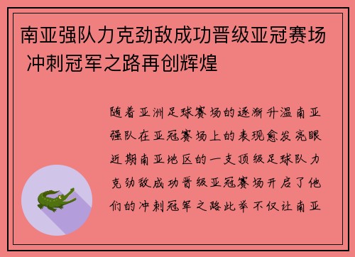 南亚强队力克劲敌成功晋级亚冠赛场 冲刺冠军之路再创辉煌